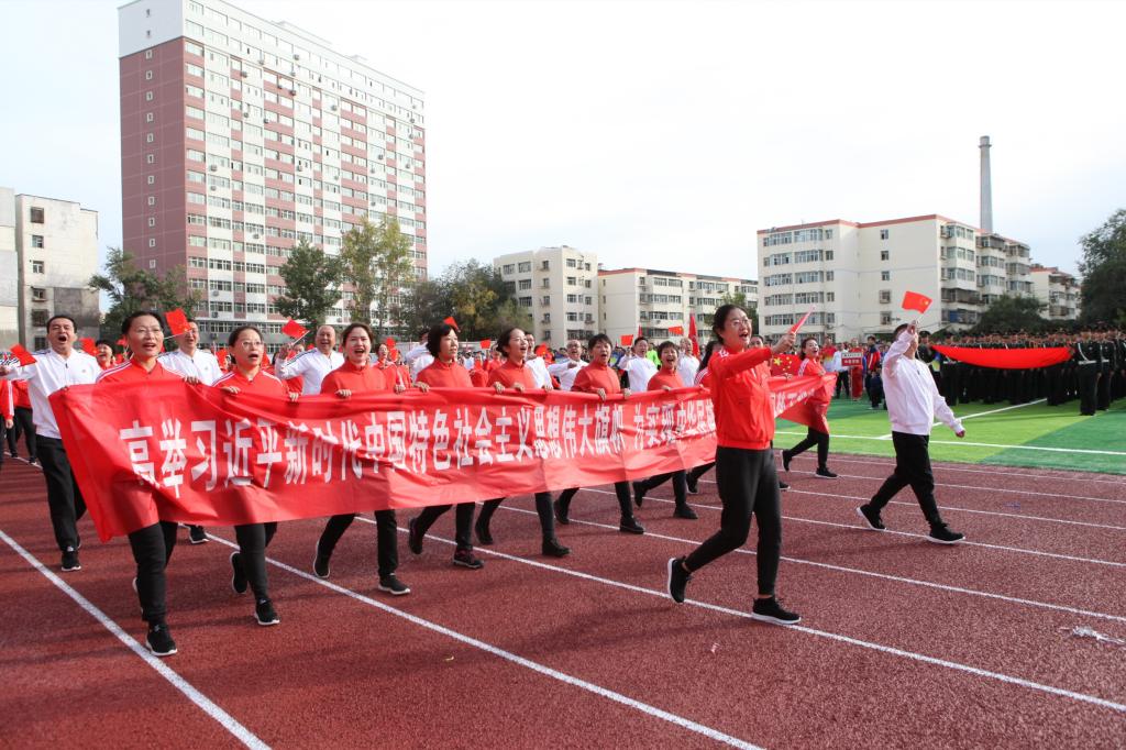 在国旗仪仗队的引领下,27个大学生、教职工方阵迈着整齐的步伐,精神饱满,口号响亮的依次通过主席台。