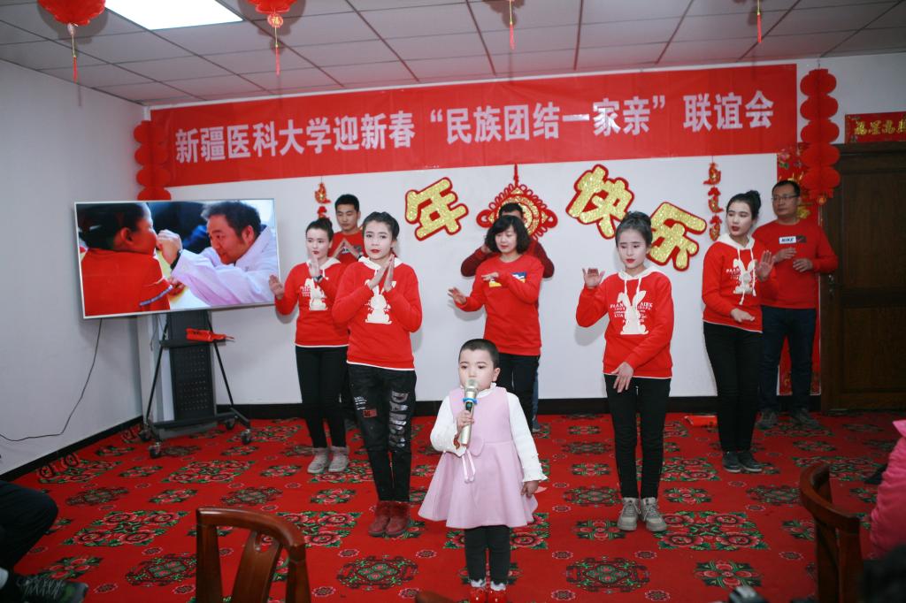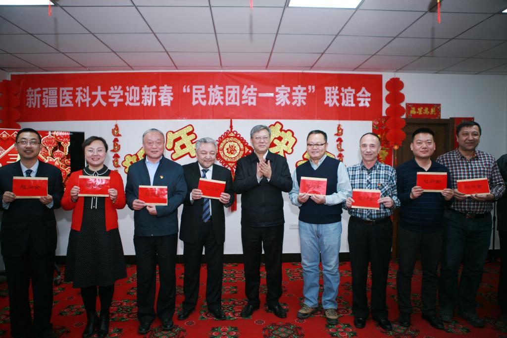 校党委书记高发水,校党委副书记、驻墨玉县工作队前方党工委书记、“访惠聚”驻村工作队总领队曹忠明,校党委常委、副校长贾文霄,校党委常委、副校长再那吾东·玉山和各附属医院领导,访惠聚驻村工作队和深度扶贫专干代表,驻墨玉县医院、结亲干部、亲戚代表等100多人欢聚一堂,热热闹闹欢度新春。