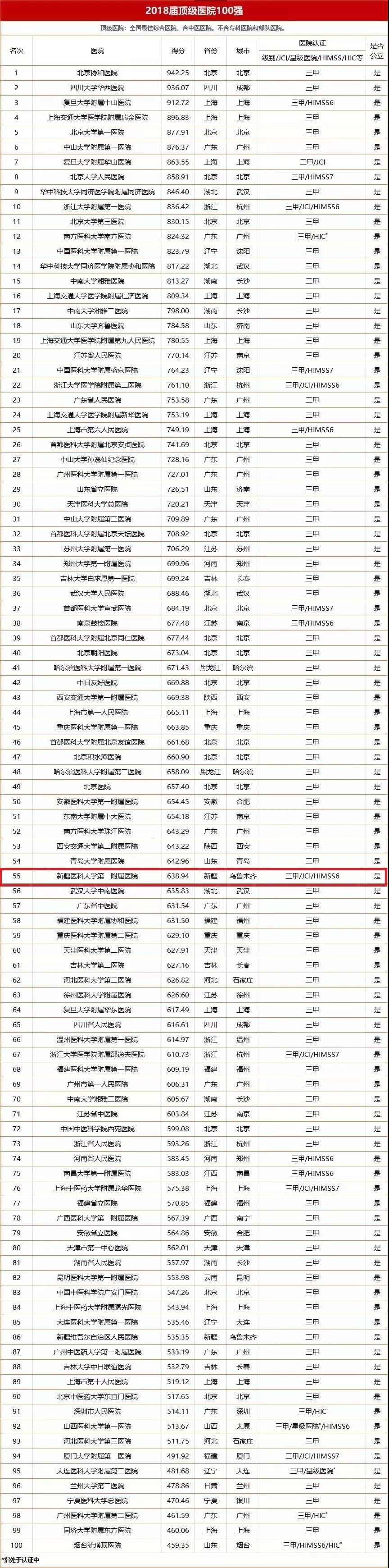 3月29日,由艾力彼主办的《2019中国医院竞争力大会》于广州召开。会场发布《2018中国医院竞争力·顶级医院100强》名单,新疆有两家医院榜上有名,其中,beat365中文在线官网第一附属医院位居第55位。