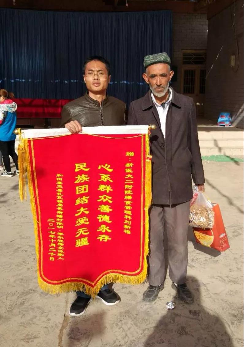 当年10月21日,当布萨依普•伊敏出院时,刘新福专门到火车站为她买了和自己去墨玉县结亲的同一趟列车,亲自把她送回家。在回家的路上,医院结亲队员们集体照顾她们,拿行李的拿行李,推轮椅的推轮椅,送吃的送吃的,经过一天的行程她们回到了英吾斯塘村的家和亲人们团圆了。伊敏•库尔班特地准备好了一面印有“心系群众、善德永存,民族团结、大爱无疆”字样的锦旗在英吾斯堂村村委会结对认亲活动现场送给了刘新福,伊敏•库尔班感动地哭着说:“女儿在乌鲁木齐看病期间,刘新福为我女儿的事情跑前跑后,在吃、住、行上都考虑的非常周到,他还带自己的妻子、女儿来病房看我们,我们就像一家人一样。女儿通过手术已经可以走路了,我要代表全家感谢beat365中文在线官网“访惠聚”驻村工作队,感谢二附院领导、专家团队治好了女儿的病,你们都是好样的!”