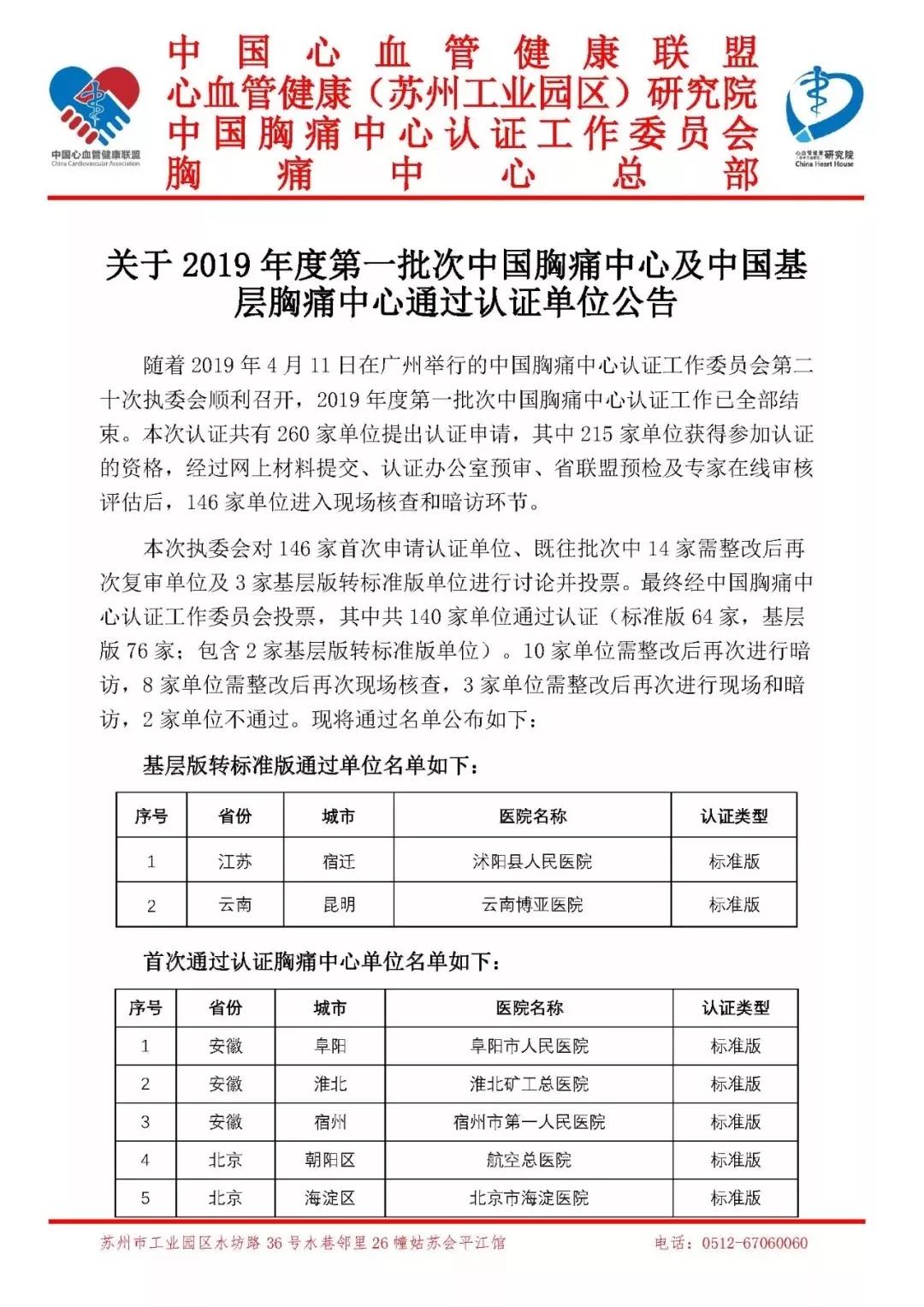 2018年11月,医院胸痛中心申报了国家2019年度第1批中国胸痛中心认证。经过资料审核,暗访,专家现场核查等多个环节的考核,于2019年4月在中国胸痛中心认证工作委员会第二十次执委会上,经专家投票表决,认为医院胸痛中心的建设已符合中国胸痛中心认证标准,顺利通过认证,将择期正式授牌。