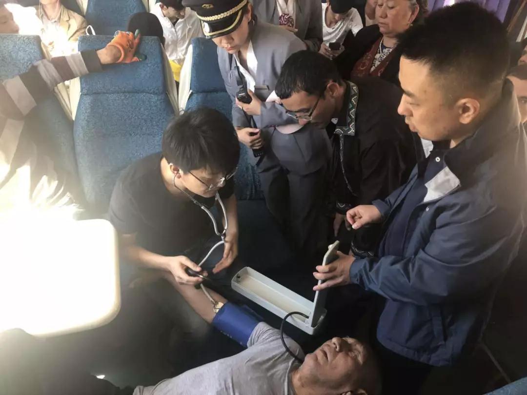 不久,列车员又急急忙忙来到车厢,原来隔壁车厢又有一名乘客晕倒了。肿瘤二科医生帕提玛·阿不力米提与肝病科医生郭峰迅速起身前往进行救助,一直看护在该乘客身边,直到不适症状缓解才离开.