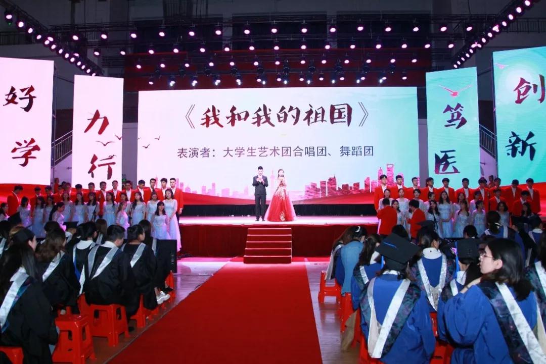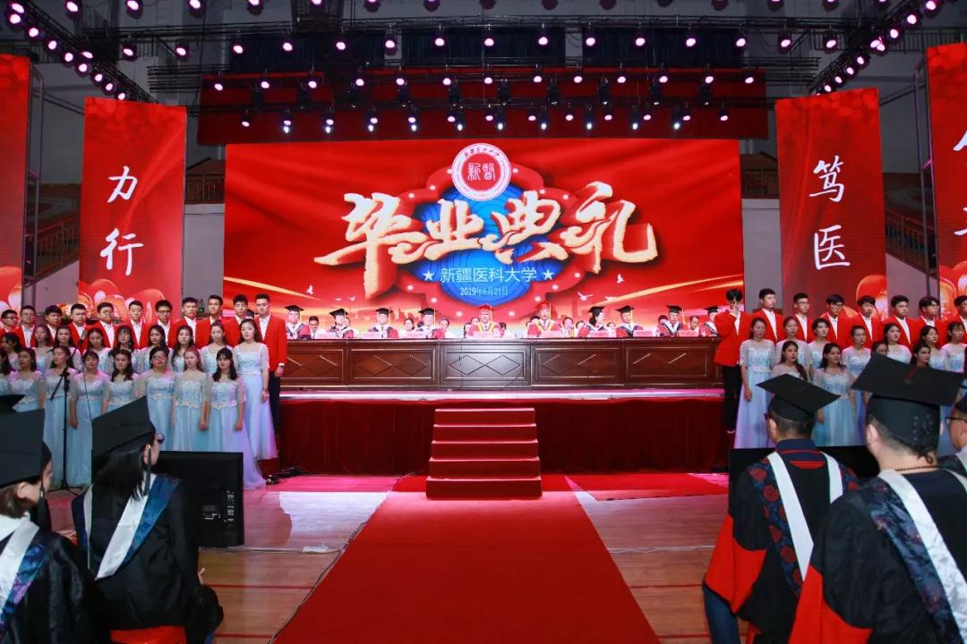 毕业典礼暨学位授予仪式结束后,现场的师生们共同观赏了“医生医世,医路起航”毕业晚会。临床教学楼800人会议厅、图书馆六楼报告厅、克拉玛依学院体育馆、一附院科技楼报告厅通过视频的形式同步收听收看了毕业典礼和晚会。