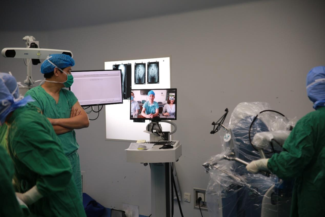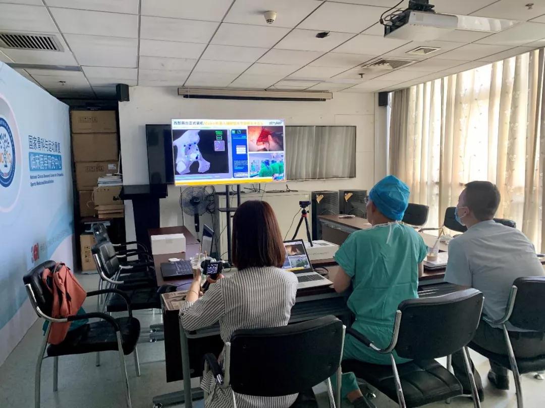 上午 11 点,曹力教授团队远程连线解放军总医院第一医学中心骨科陈继营教授,仔细探讨了病人的术前计划,从假体型号、定位到假体植入后的复位情况。11点30分,关节团队完全按照术前计划开始进行机器人手术。从暴露到参考架安装、从髋臼注册到机器人辅助磨锉,MAKO 机器人引导髋臼杯精确地安装至术前计划位置,并进行了复位检测,手术进行顺利,一气呵成,只用了 35 分钟,所有参数精确到 1 毫米,1 度。