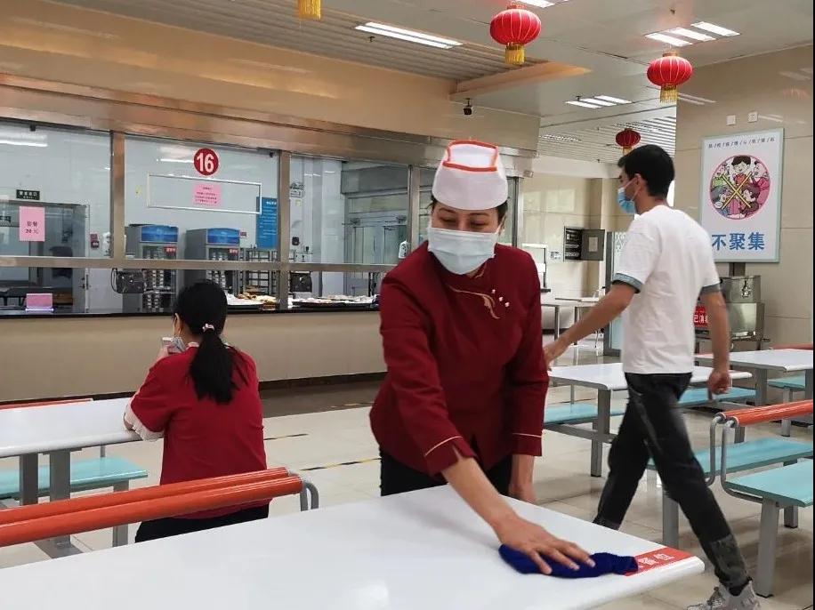在学苑餐厅一楼的大厅里,色麦尔江的妻子阿依古再丽·如则麦麦提正和同事们清扫着餐厅卫生,为前来就餐的同学们营造干净、整洁的环境。