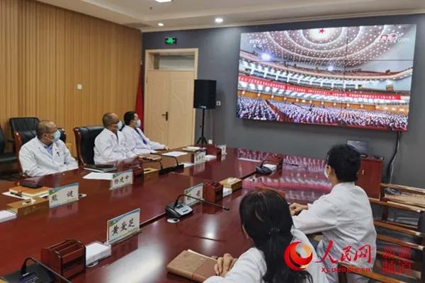 杨建中和同事一起观看全国抗击新冠肺炎疫情表彰大会