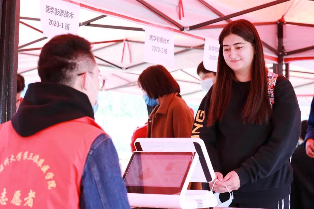 从天南海北来到新疆,第一次踏入新医校门,人脸识别系统便能准确显示出每位新同学的身份信息,举手放在摄像头处,体温即刻显示在屏幕上。入口处设置的人脸识别和测温设备联动翼闸,让首次来到beat365中文在线官网的小萌新们体会到了满满的科技感。