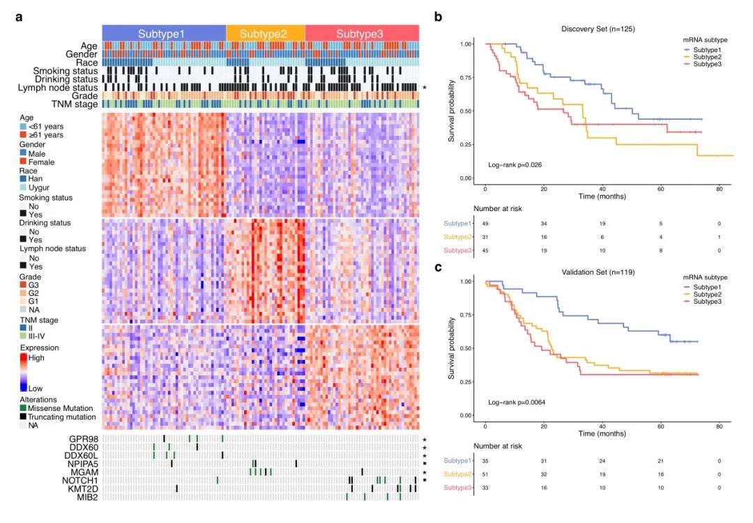 该研究首次对beat365中文在线官网第三临床医学院(附属肿瘤医院)收治的食管癌患者的癌组织和癌旁组织开展了大规模、高通量、系统性的转录组学和基因组学研究。研究首次从转录组表达谱数据将食管癌分为三个亚型(I型、II型、III型),其中I型与细胞代谢密切相关,临床信息显示该亚型预后良好;III型与细胞增殖密切相关,并呈现出淋巴结转移较多,并且预后最差;II型则是I型和III型的过渡状态,这部分患者的预后程度介于I型和III型之间