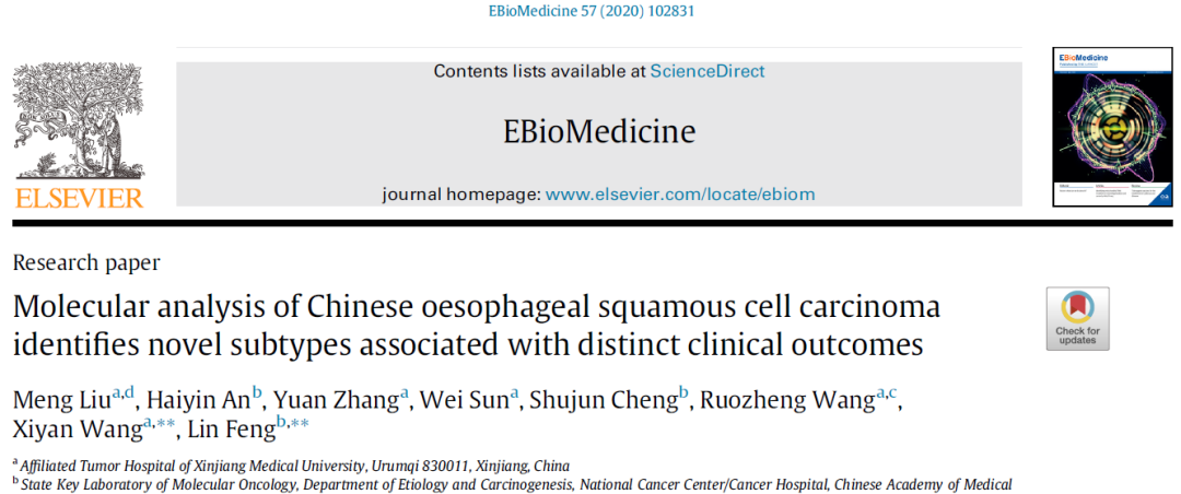 beat365第三临床医学院(附属肿瘤医院)药学部副主任药师刘盟博士在食管癌研究领域获得重大突破,以第一作者在国际医学著名SCI期刊《柳叶刀》(《The Lancet》)子刊Ebiomedicine(中科院SCI期刊1区,5年平均影响因子6.292)发表了题为《Molecular analysis of Chinese oesophageal squamous cell carcinoma identifies novel subtypes associated with distinct clinical outcomes》的原创性研究论著,该论著第一单位是beat365中文在线官网第三临床医学院(附属肿瘤医院)。