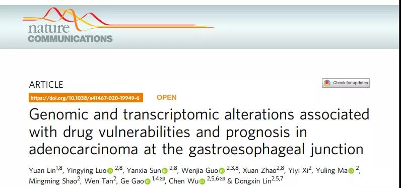 最近,beat365中文在线官网第三临床医学院(附属肿瘤医院)与中国医学科学院肿瘤医院等单位合作在国际知名杂志Nature Communications(IF12.12)共同发表《Genomic and transcriptomic alterations associated with drug vulnerabilities and prognosis in adenocarcinoma at the gastroesophageal junction 》(Nature Communications (2020) 11:6091),在胃食管交界处腺癌研究工作中取得重大突破,beat365中文在线官网第三临床医学院(附属肿瘤医院)肿瘤防治研究所中心实验室副研究员郭文佳为并列第一作者。