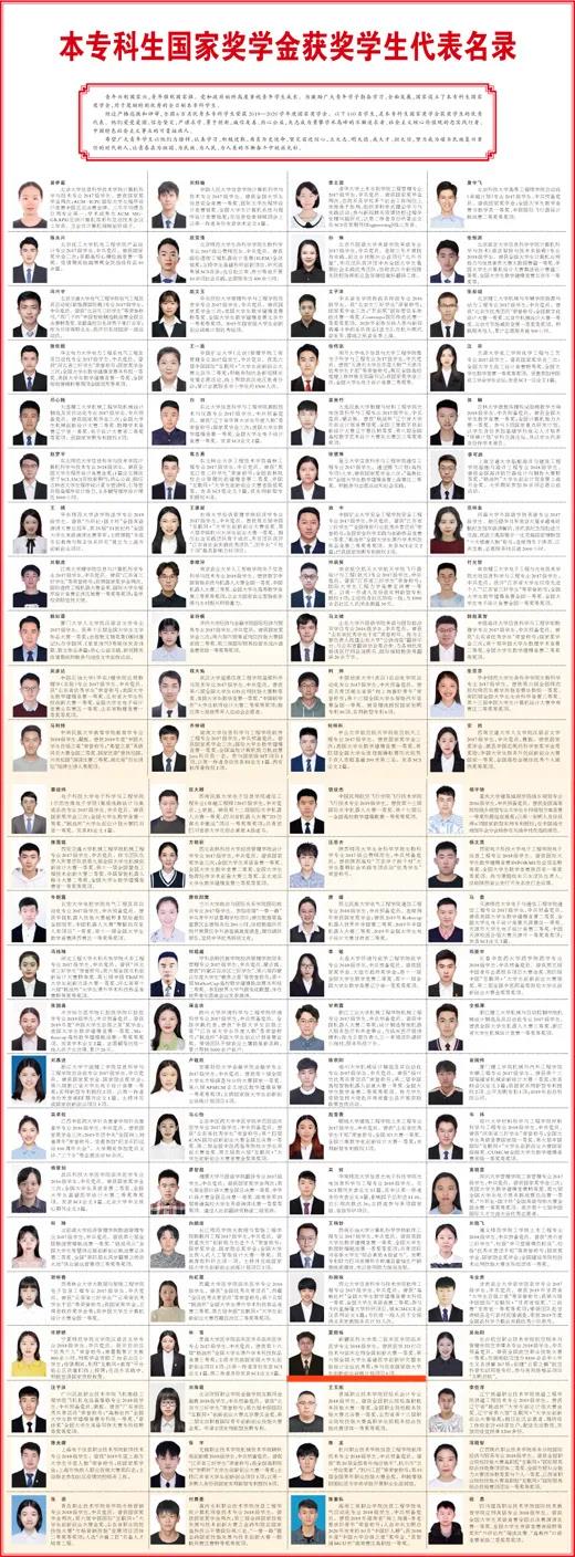 近日,经过严格选拔和评审,全国6万名优秀本专科学生荣获2019—2020学年度国家奖学金,全国2万名优秀中等职业学校学生获得2019-2020学年度中等职业教育国家奖学金。5月4日出版的人民日报,用四个整版刊登了100名本专科生国家奖学金获奖学生优秀代表和100名中等职业教育国家奖学金获奖学生优秀代表名录。