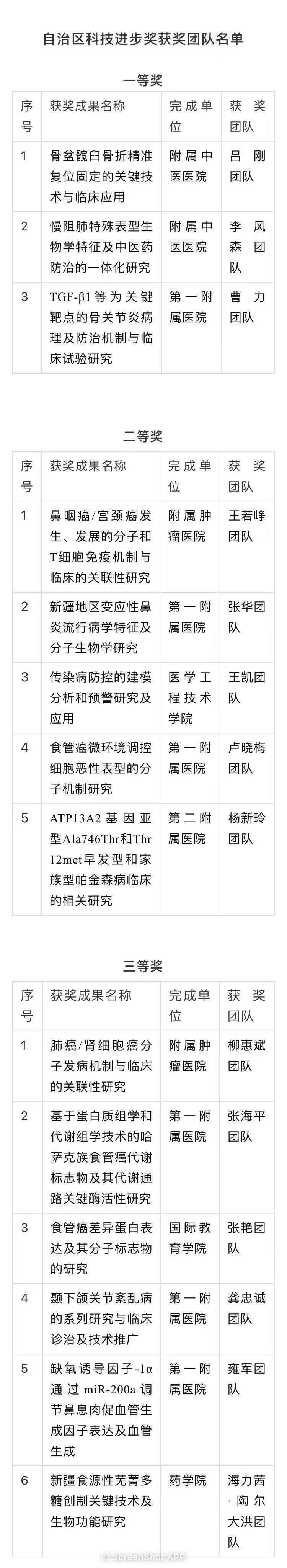 近日,自治区人民政府公布了“2020年度自治区科学技术奖获奖科技成果和突出贡献奖”获奖人员名单。beat365中文在线官网14个团队荣获2020年度自治区科学技术奖。其中,自治区科技进步奖一等奖3项、二等奖5项、三等奖6项,继续蝉联自治区高校第一,并连续6年获得两项以上自治区科技进步奖一等奖,为我区科学技术进步、学科发展与人才培养以及新疆卫生健康的事业发展做出了贡献。