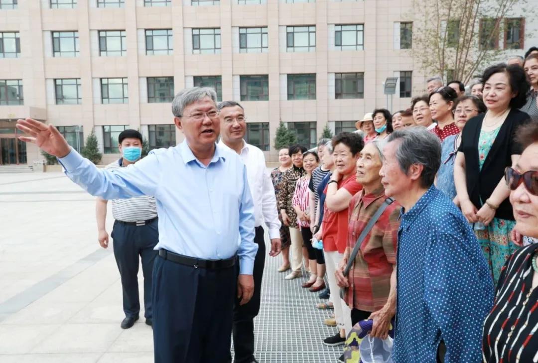 参观活动接近尾声时,高发水书记和凯赛尔·阿不都克热木校长来看望老同志们,并给大家介绍雪莲山校区的建设情况和校园现代化的设计理念。