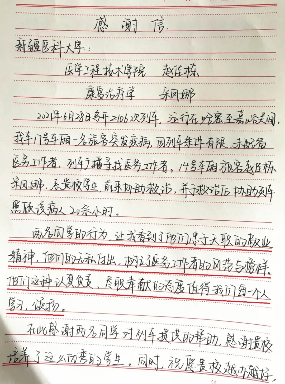 回家路上遇到的这段“小插曲”,两人最初并没有放在心上。一周后,这封感谢信的出现,让学校得知了两名医学生英勇救人的事迹。