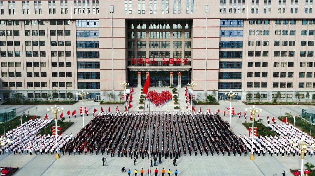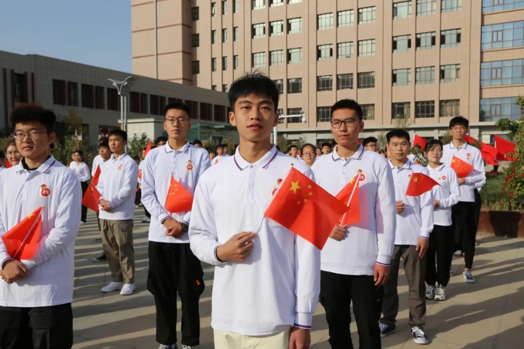 “升国旗,奏唱国歌!”在雄壮的《义勇军进行曲》中,五星红旗冉冉升起、迎风飘扬。全体师生肃立挺拔,向国旗行注目礼,齐唱国歌,浓烈的爱国情怀在师生们心中升腾、激荡。