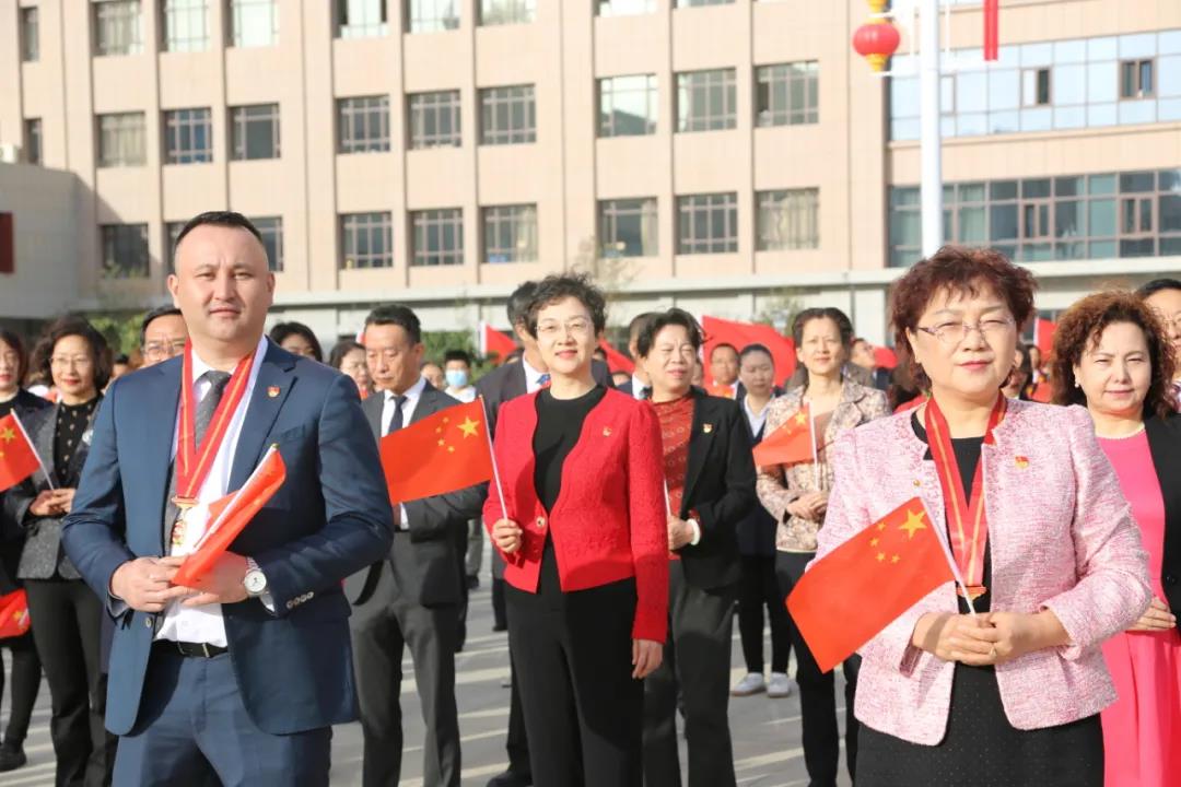 全体在家校领导、离退休领导及专家、全国及自治区优秀共产党员、全国抗疫先进个人、援疆干部代表,新疆首批援鄂医疗队、教学及医疗专家代表,全校副处级及以上干部、机关全体干部和雪莲山校区师生代表参加了在雪莲山校区举行的升旗仪式。