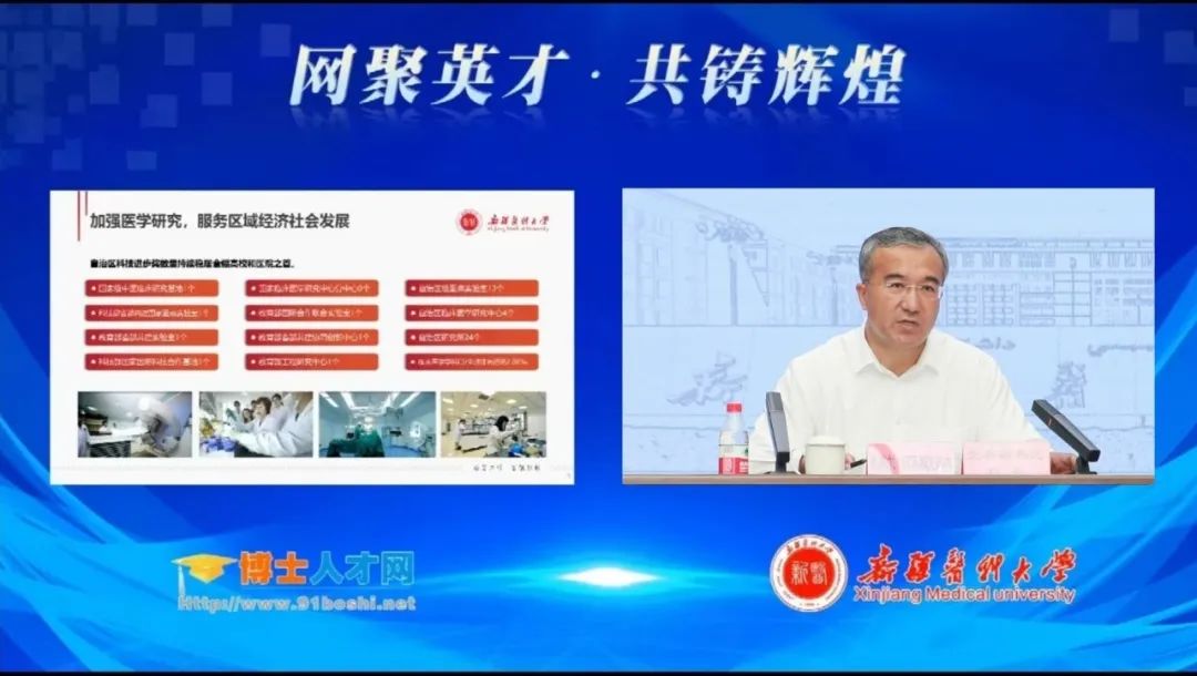 在云直播中,beat365中文在线官网党委副书记、校长凯赛尔·阿不都克热木向海内外青年博士介绍了beat365中文在线官网的人才建设与培养情况,着重介绍了学校八家附属医院的科研团队、专业学科平台、医学研究水平、医疗技术水平与社会服务能力,强调了beat365中文在线官网高度重视人才引育工作,学校始终把高素质人才队伍建设作为学校持续发展的第一资源和核心竞争力,并对学校的人才引进力度和人才管理配套政策进行了全面的解读。
