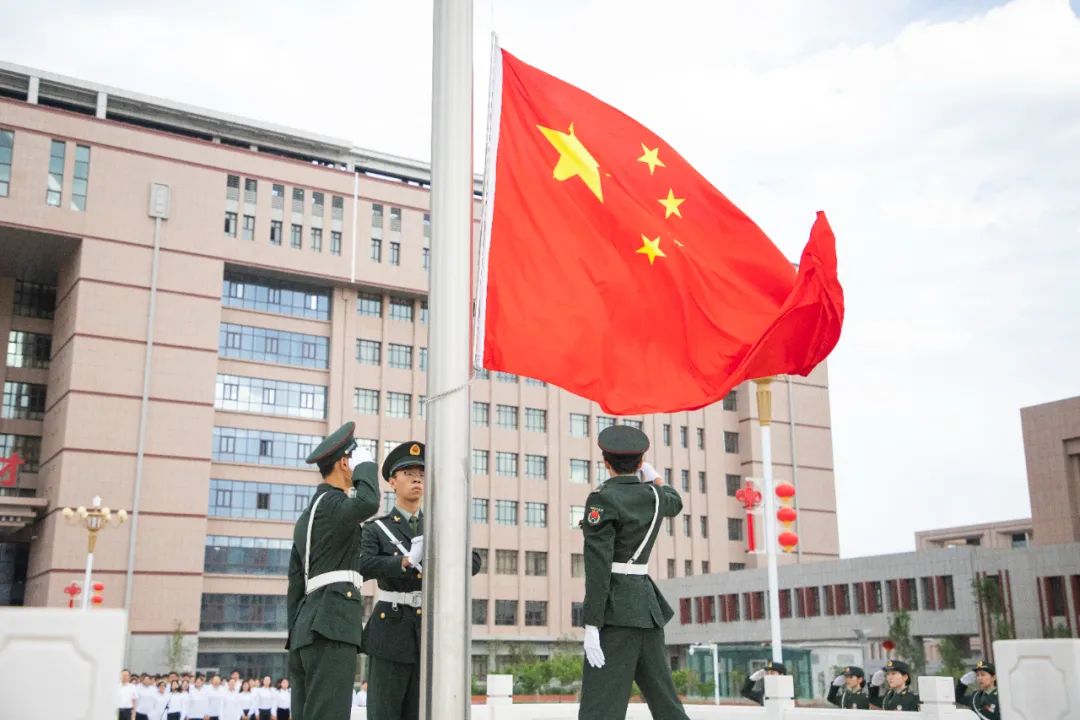 9点整,新医干部师生们整齐列队、肃立注目,国旗护卫队高擎着五星红旗,步伐坚定有力地走向升旗台。在高亢的国歌声中,鲜红的国旗迎风招展,高高飘扬。