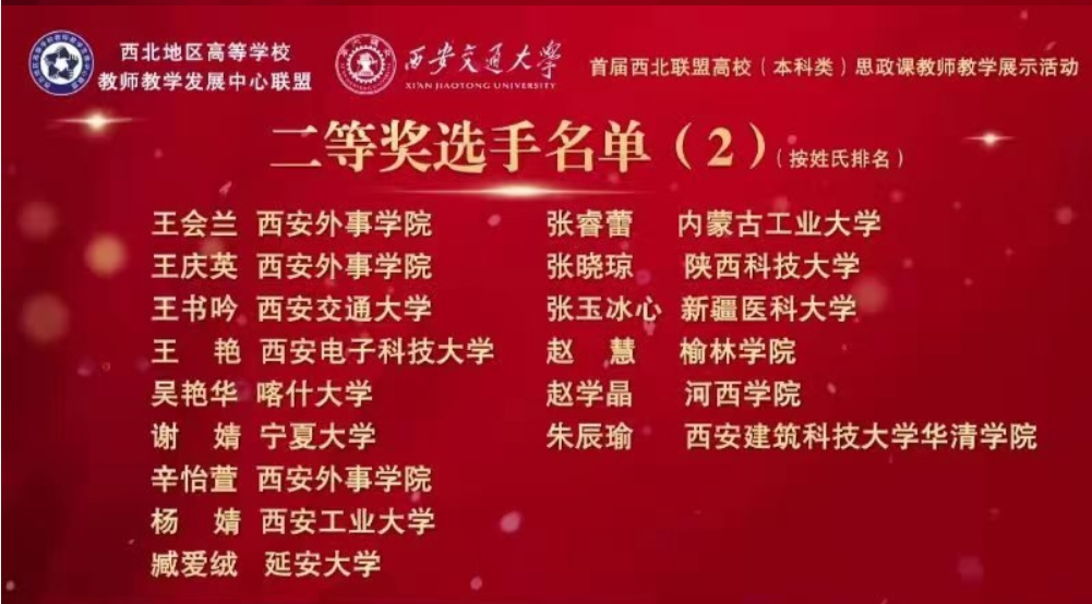 11月20日,首届西北联盟高校思政课教师教学展示活动结束,beat365中文在线官网马克思主义学院教师张玉冰心荣获二等奖;肖宇和骆育芳荣获三等奖,展示了beat365思政课程教师的授课风采,推动了学校思政课程教学高质量创新发展。