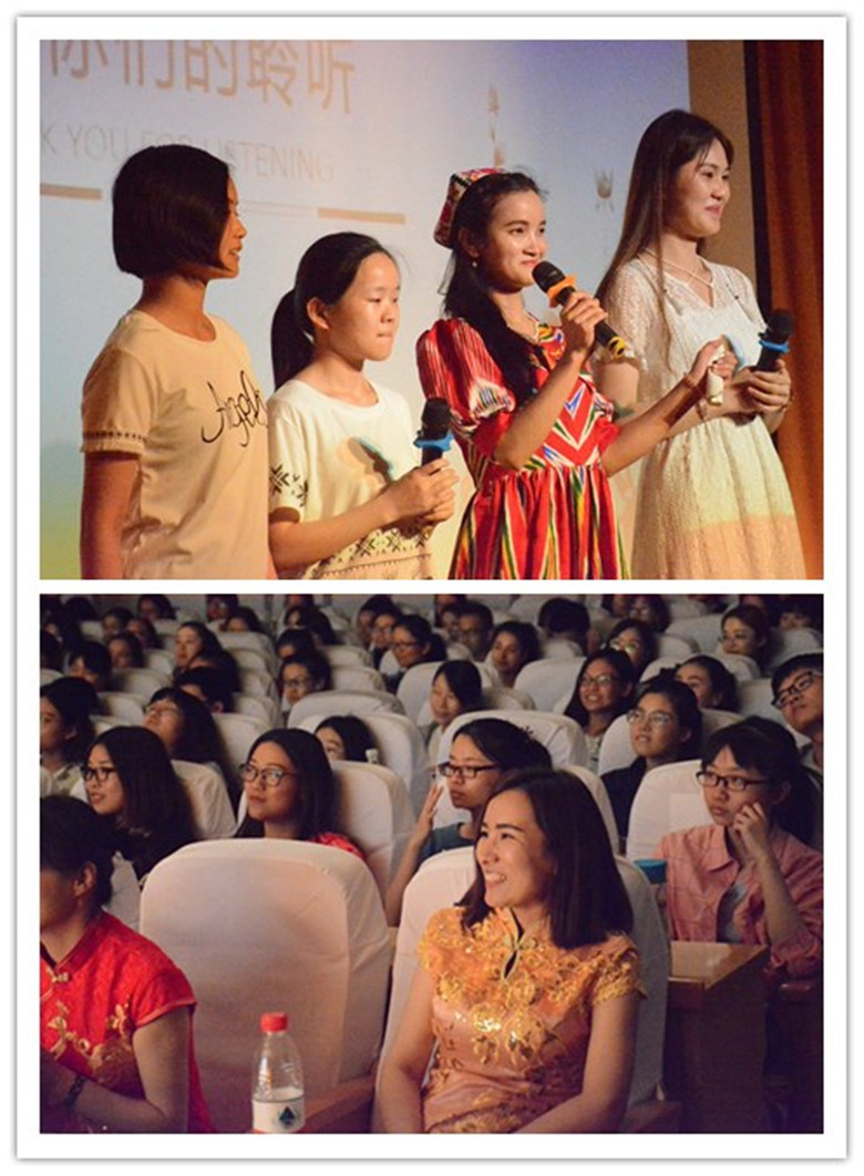 接下来由大一和大二的同学带来了“我的宿舍我的家”演说。在各位同学生动的解说下,我们仿佛身临其境一般,感受到了宿舍同学之间发生的点点滴滴,每位同学的性格被展现的淋漓尽致,有欢声笑语,有互帮互助,还有同学之间的温情,每一件小事无不体现出民族团结。“我的宿舍我的家”使台下的观众们不禁想起自己寝室的点点滴滴,回想起自己的美好的大学生活。