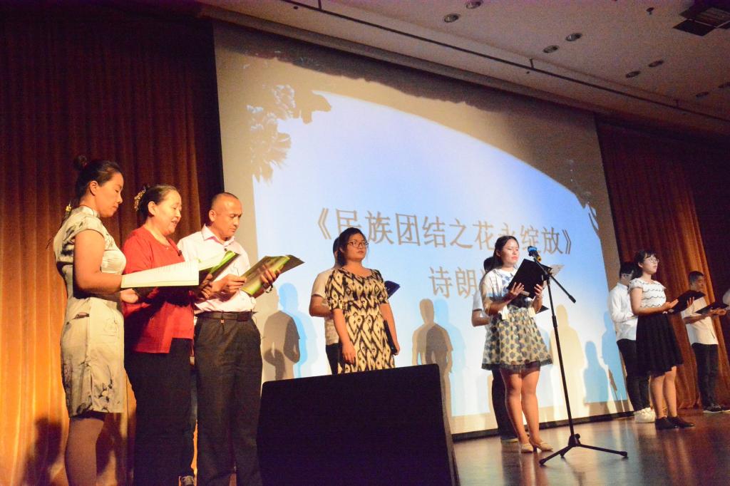 本次晚会共计六个节目,每个节目都别具一格,相互编织成了一场精彩的演出。来自卫生事业管理专业的同学们和3位老师,用满腔热血带来的民族团结诗朗诵,演绎着对民族团结的拥护和热爱,引起了台下师生们的共鸣,热烈的掌声充满了整个会场。
