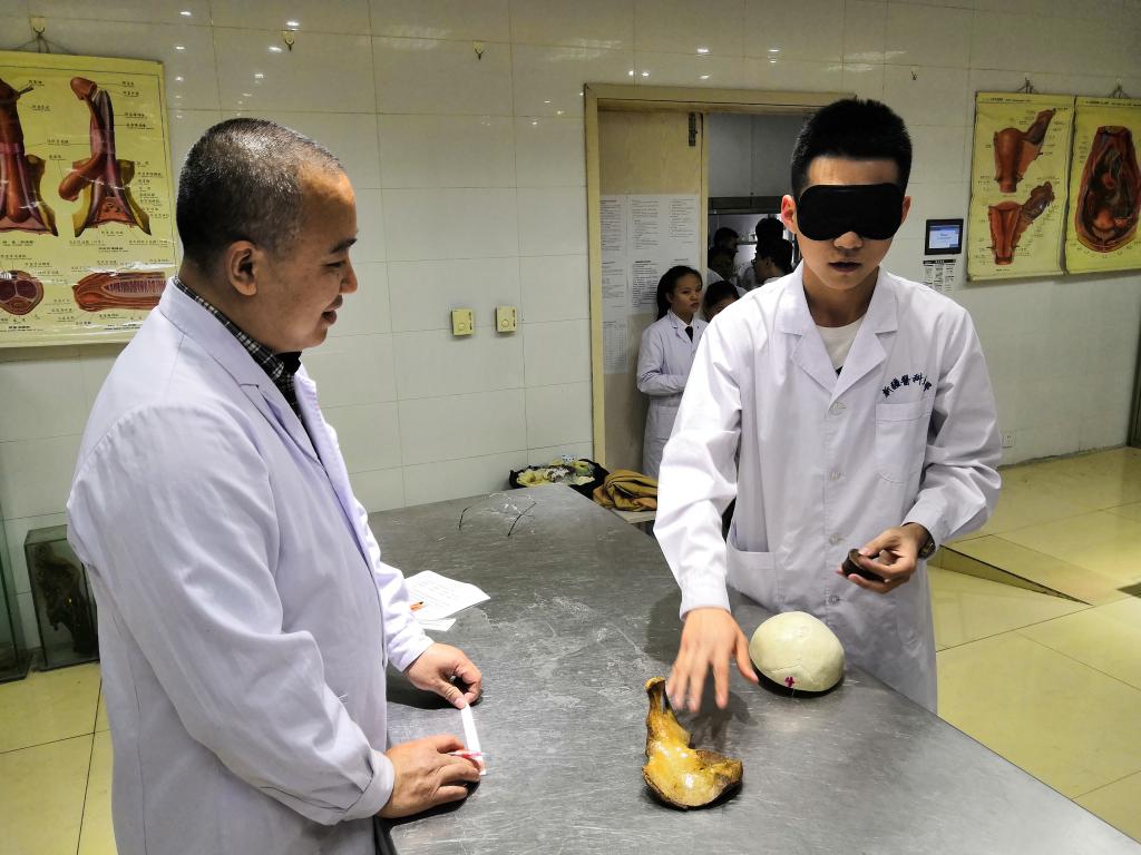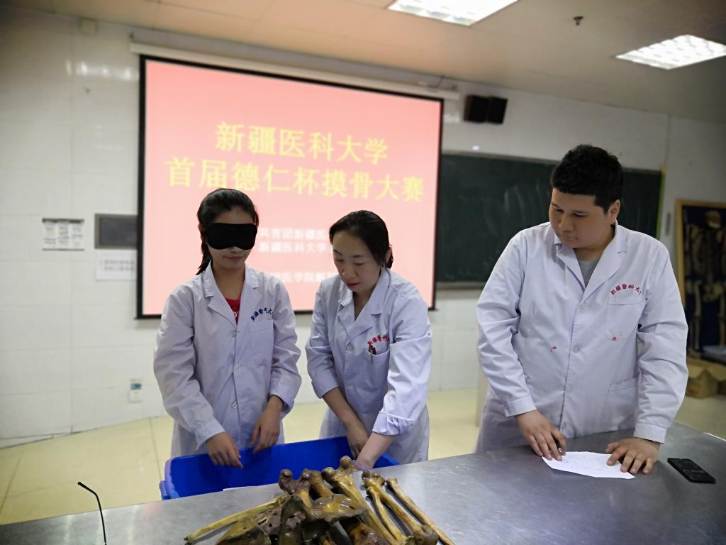 本次摸骨大赛的比赛环节学生均需在遮眼状态下盲摸进行,不仅考察学生对所学知识的掌握程度,更注重锻炼综合能力和动手能力。大赛共吸引基础、临床、口腔、预防等12个专业64支代表队共计256名同学参加。经过“慧眼识骨”、“ 摸骨知名”、“ 知名寻骨”、“知著亦微”四个环节的小组赛以及“摸骨我最强”的抢答环节,最终临床医学2018-8班的古丽米热•对先别克等同学以140分的优异成绩获得大赛第一名,张博翔等同学分别获得大赛二、三等奖和优秀奖。