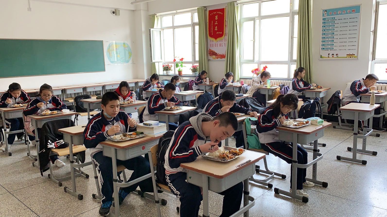 为了让学生们吃得更加卫生、安全、便捷,附属中学从今天起实施全封闭管理,附属中学1200余名学生的午餐均有大学学苑餐厅提供中午配餐服务,将午餐送到教室,学生在教室就餐。