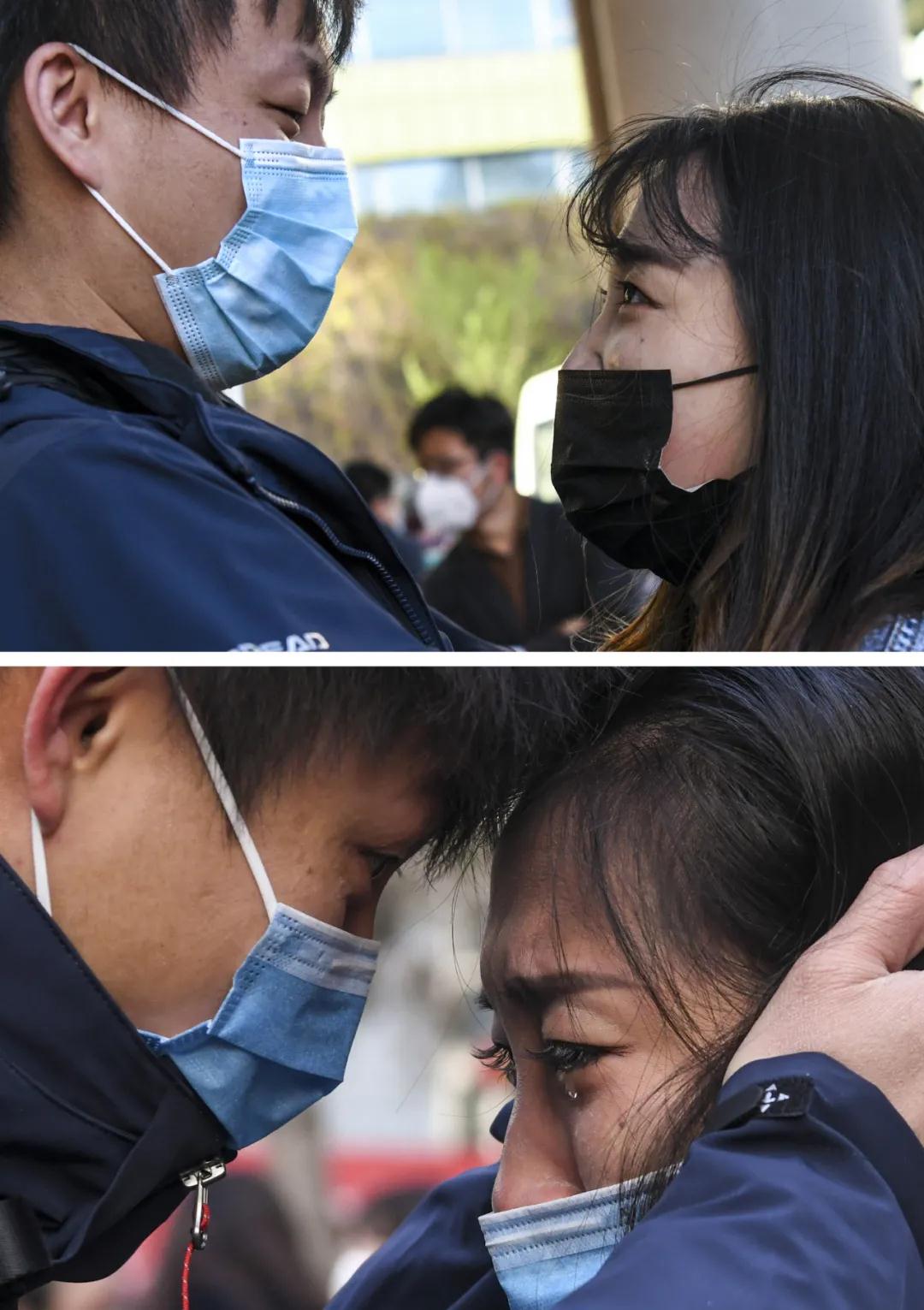 拼版照片:上图为4月23日,beat365中文在线官网第一附属医院重症监护室医护人员吕俊(左)解除隔离后与未婚妻王鹤团聚;下图为1月28日,在beat365中文在线官网院内,支援湖北医疗队队员吕俊(左)与未婚妻王鹤道别。当日,新疆首批支援湖北医疗队的医护人员解除隔离休整,与久别的同事、亲友重逢。新华社记者 王菲 摄