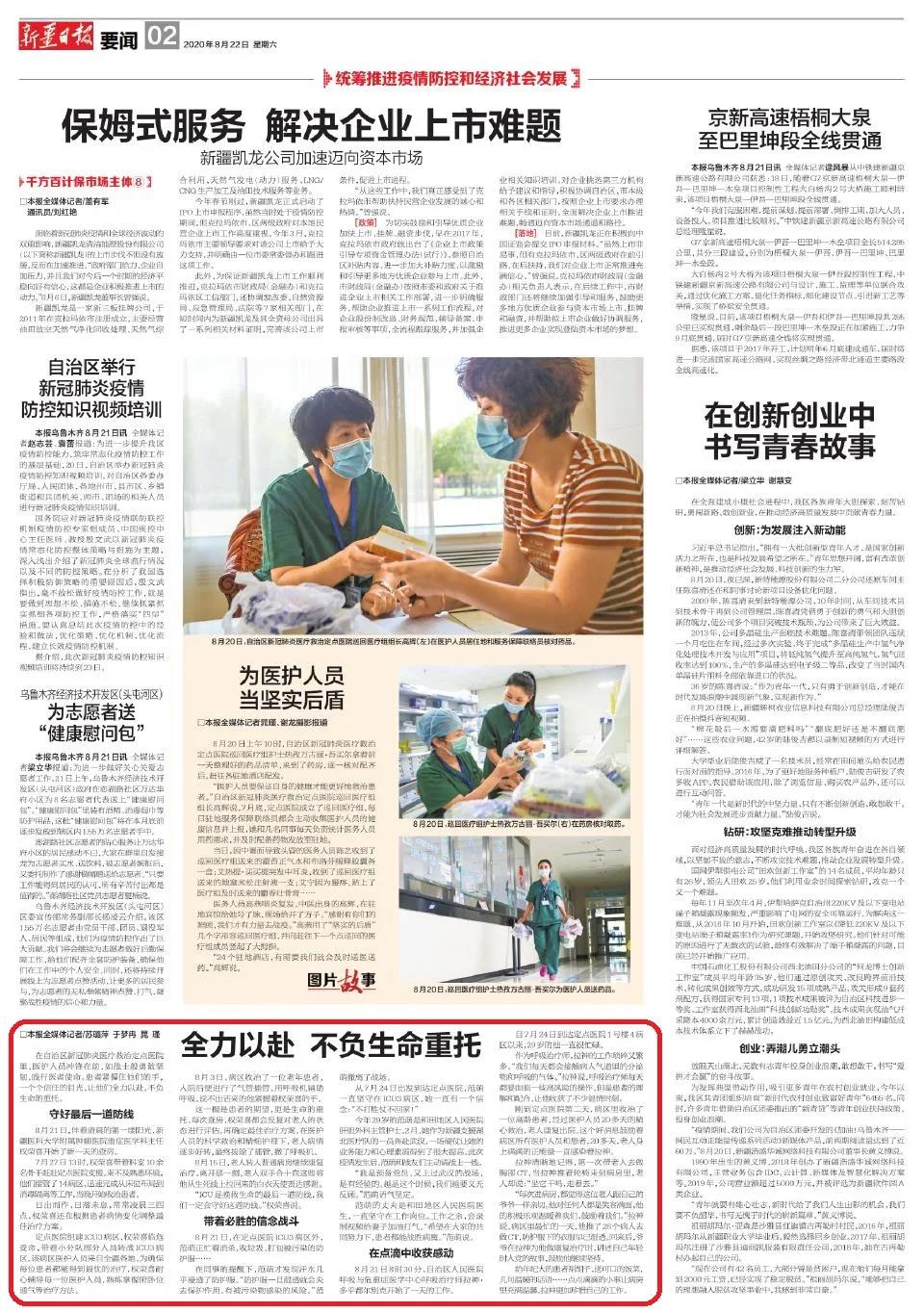 在自治区新冠肺炎医疗救治定点医院里,医护人员冲锋在前,如战士般勇敢坚韧,践行医者使命。患者紧握住他们的手,一个个信任的目光,让他们全力以赴,不负生命的重托。