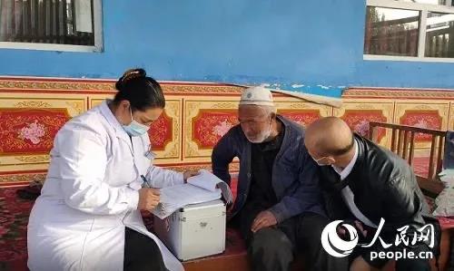 工作队员托乎提·吐逊带着村医苏迪木汗·麦麦提敏,为包户群众诊疗
