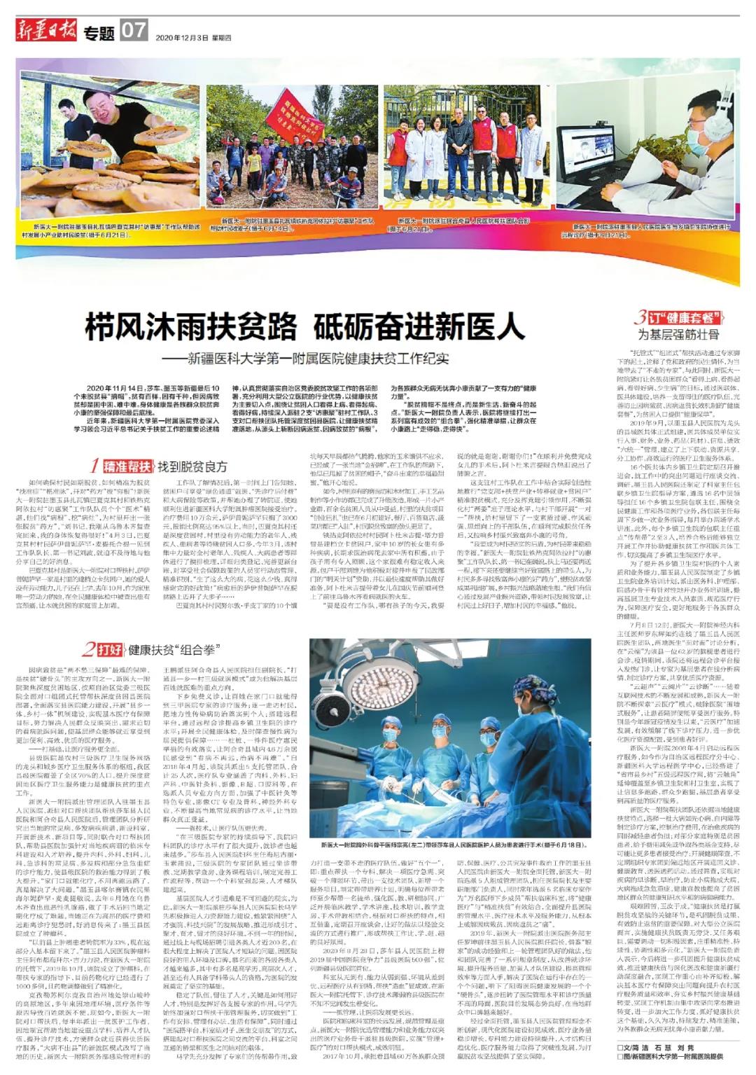 艰难困苦,玉汝于成。“健康扶贫是打赢脱贫攻坚战的关键环节,是巩固脱贫成果、有效防止返贫的重要保障。对大型公立医院而言,实施健康扶贫既责无旁贷,又任务艰巨,需要调动一切积极因素,注重精准性、持续性、协调性和多元化。”新医大一附院负责人表示,今后将进一步巩固提升健康扶贫成效,推进健康扶贫与深化医改和健康新疆行动深度融合,实现工作重心由补齐短板、解决基本医疗有保障突出问题向提升农村医疗服务质量和效率、夯实乡村振兴健康基础转变、实现工作机制由集中攻坚向常态推进转变,进一步加大工作力度,抓好健康扶贫这个基础,久久为功、持续发力、精准施策,为各族群众无病无忧奔小康贡献力量。