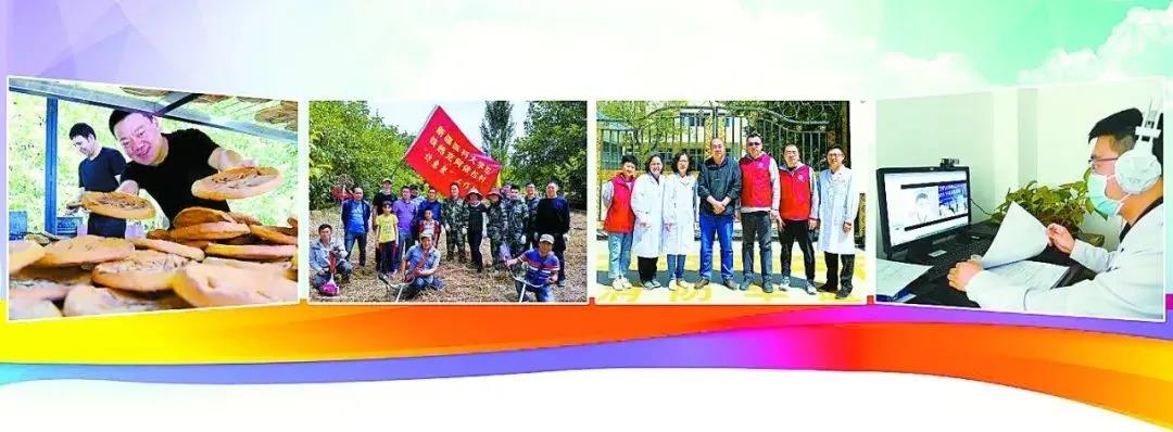 (左一)新医大一附院驻墨玉县扎瓦镇巴夏克其村“访惠聚”工作队帮助该村发展小产业助村民脱贫(摄于6月21日)。(左二)新医大一附院驻墨玉县扎瓦镇铁热克阿依拉村“访惠聚”工作队帮助村民收麦子(摄于6月14日)。(右二)新医大一附院派驻阿合奇县人民医院帮扶团队合影(摄于6月21日)。(右一)新医大一附院派驻墨玉县人民医院医生与乡镇卫生院协作进行远程诊疗(摄于6月21日)