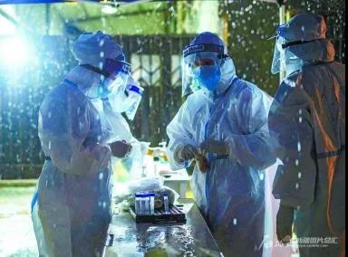beat365中文在线官网第五临床医学院(第五附属医院)医护人员在乌鲁木齐高新技术产业开发区(新市区)金谷社区株洲路诚信祥综合市场西门核酸检测采样点,冒雨做核酸检测采样(2020年7月23日摄)