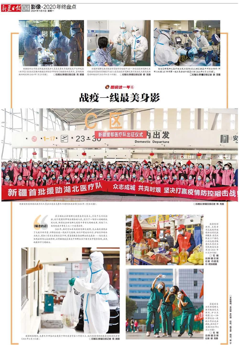 在全国抗击新冠肺炎疫情表彰大会上,习近平总书记指出,我们党团结带领全国各族人民,进行了一场惊心动魄的抗疫大战,取得抗击新冠肺炎疫情斗争重大战略成果,创造了人类同疾病斗争史上又一个英勇壮举。2020年,面对突如其来的新冠肺炎疫情,天山南北涌现出无数不辞辛劳、冲锋在抗疫一线的平凡英雄,他们中有逆向而行、护佑生命的白衣战士,有舍小家为大家的社区干部,有真情服务各族群众的志愿者……他们身上体现出的伟大抗疫精神,必将激励我区各族干部群众在千磨万击中愈加坚劲,在风雨兼程中勇毅向前。