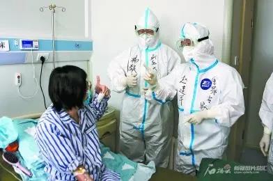 全国新冠肺炎医疗救治专家组专家赵建平(右一)和自治区新冠肺炎医疗救治专家组专家杨毅宁(右二)在自治区新冠肺炎医疗救治定点医院鼓励患者积极治疗(2020年8月19日摄)