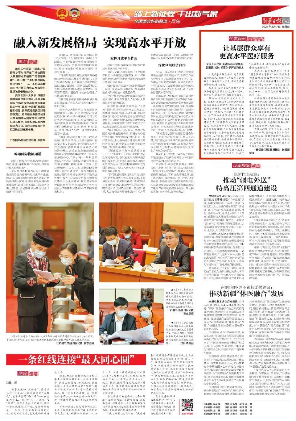 beat365中文在线官网是全疆唯一独立建制的医学院校,医学教育与医疗卫生资源优势得天独厚,在健康扶贫、医疗扶贫中发挥了积极作用。2020年,新冠肺炎疫情防控阻击战中,作为一名人大代表,我和医护人员一道连续奋战在新冠肺炎患者救治、康复治疗、核酸采集、院感防控等第一线,圆满完成了党和人民的重托。