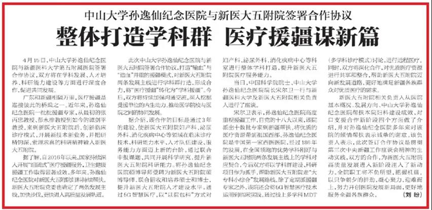 宋尔卫表示,孙逸仙纪念医院高度重视援疆工作,自党的十八大以来,该院派出十数批专家到新疆帮扶,将优质的医疗资源带到祖国西部。孙逸仙纪念医院是中国第一家西医医院,经过186年的发展,在全国领跑的优势学科刚好与新医大五附院两条发展主线上的学科对应契合,今后双方将以学科群建设、科研项目作为抓手,帮助新医大五附院走“大专科小综合”发展路线。除了定期派援疆专家之外,该院还会将5G智慧医疗技术运用到临床实践,通过线上多学科MDT(多学科诊疗模式)讨论,进行远程医疗。同时,双方将深化合作,对优质医疗资源进行共享和整合,帮助新医大五附院迈向新发展道路,更好地满足新疆各族群众对优质医疗的需求。