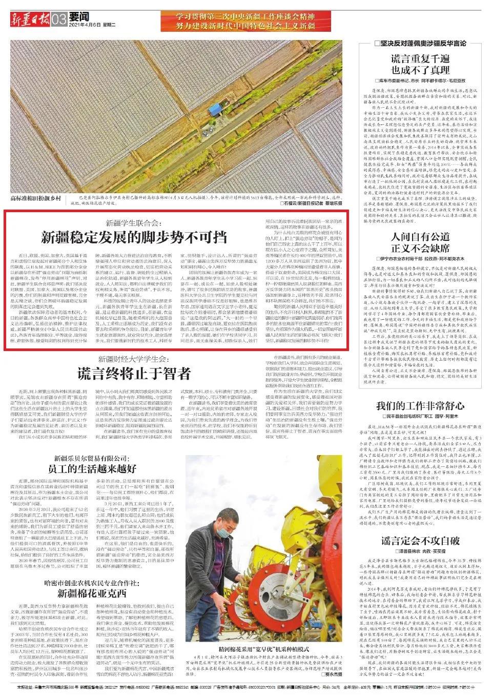 勤劳的新疆人民用双手创造幸福美好的生活,不允许任何人抹黑,谁都阻挡不了新疆前进的脚步!新疆棉花质量很好,你们泼再多的脏水也掩盖不住新疆棉花的雪白!我们坚信,有祖国作为强大后盾,一切妄图破坏新疆人民美好生活的阴谋必将灰飞烟灭!我们坚信,新疆稳定发展的脚步势不可挡!