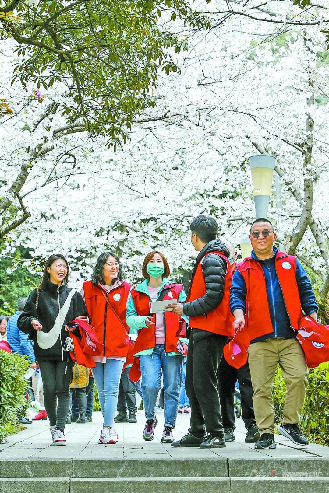 13日上午,在大学生志愿者的引导下,医护人员前往樱花大道,开启赏樱之旅。在赏樱专场入口,武汉大学设置了医护人员专用赏樱通道。一路上,一簇簇樱花如云似雪、温润如玉,beat365中文在线官网第五附属医院中医科护士长须玉红的心情无比愉悦。360度无死角拍摄、视频通话直播、自拍合影……须玉红和战友们玩得不亦乐乎,“我们医院就是武汉大学人民医院定点支援的,这次来就跟回家一样。”
