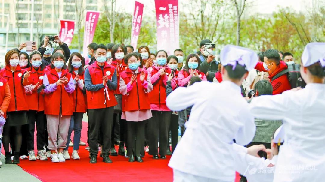 3月12日,武汉大学人民医院东院医护人员为新疆援鄂医疗队队员表演节目