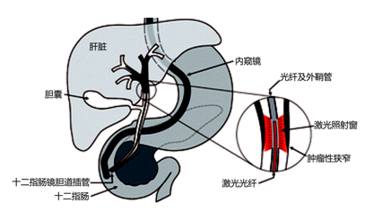 主任医师冉博告诉记者,“光动力治疗”与一般的手术治疗不同,“光动力治疗”是通过病灶局部的选择性光敏化作用来破坏肿瘤和其他病理性增生组织,通过静脉滴注光敏剂,48小时后光敏剂浓聚于肿瘤组织内,此后将光纤置于肿瘤表面,应用特殊波长的光进行照射,从而导致肿瘤组织坏死,让肿瘤“见光死”。整个过程无需全身麻醉,医生借助内镜将特殊的激光源从口腔导入体内,经十二指肠乳头插入胆道系统,在内镜及放射造影的双重精确定位下,对肿瘤部位进行照射,激发光化学反应。