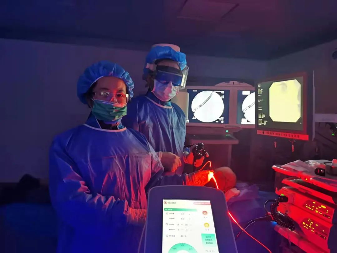 经过充分的术前评估和准备,2021年11月1日,在消化血管外科中心肝胆包虫病外科主任吐尔干艾力的指导下,主任医师冉博、疼痛科李亦梅主任、内镜中心王惠琴护士长等通力合作,成功为李先生实施了新疆首例“光动力治疗”。
