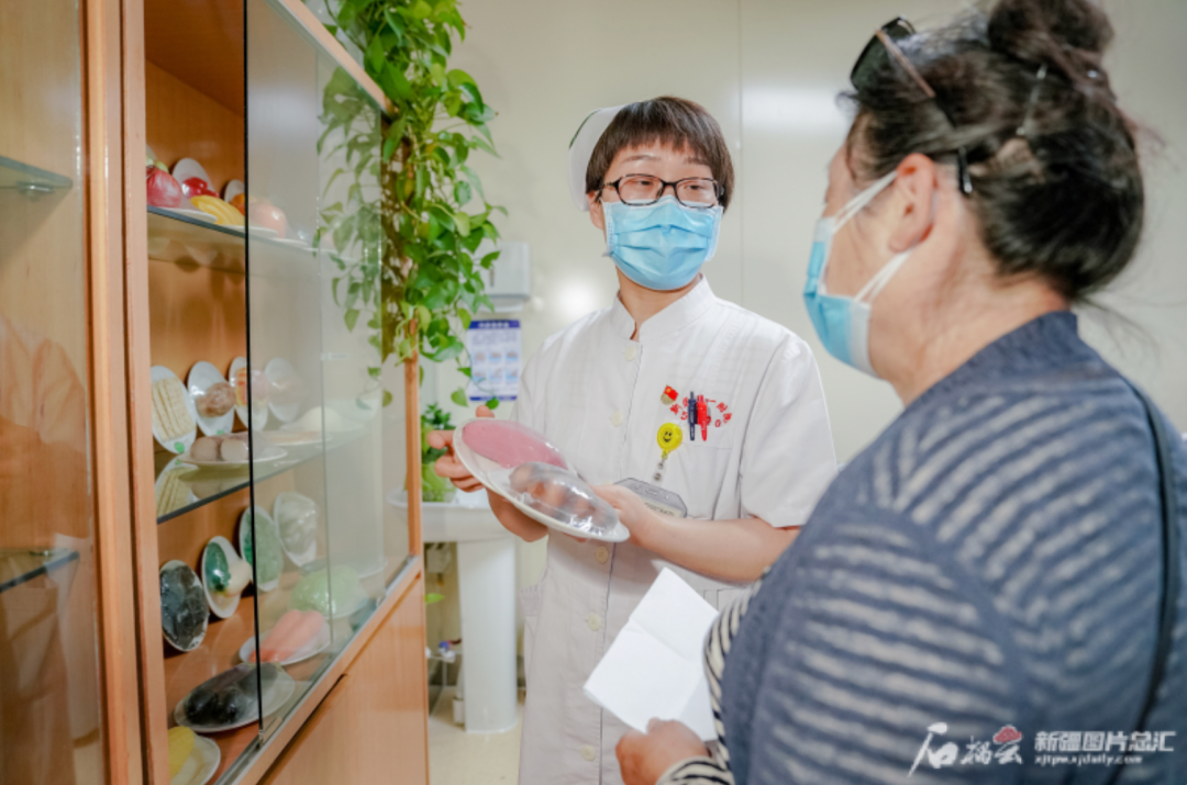 5月7日下午,beat365中文在线官网第一附属医院糖尿病护理门诊护士长徐静,向患者科普糖尿病人食谱,引导其培养健康生活方式,做好健康管理。石榴云/新疆日报记者 豆兴军摄