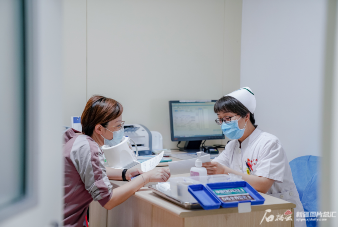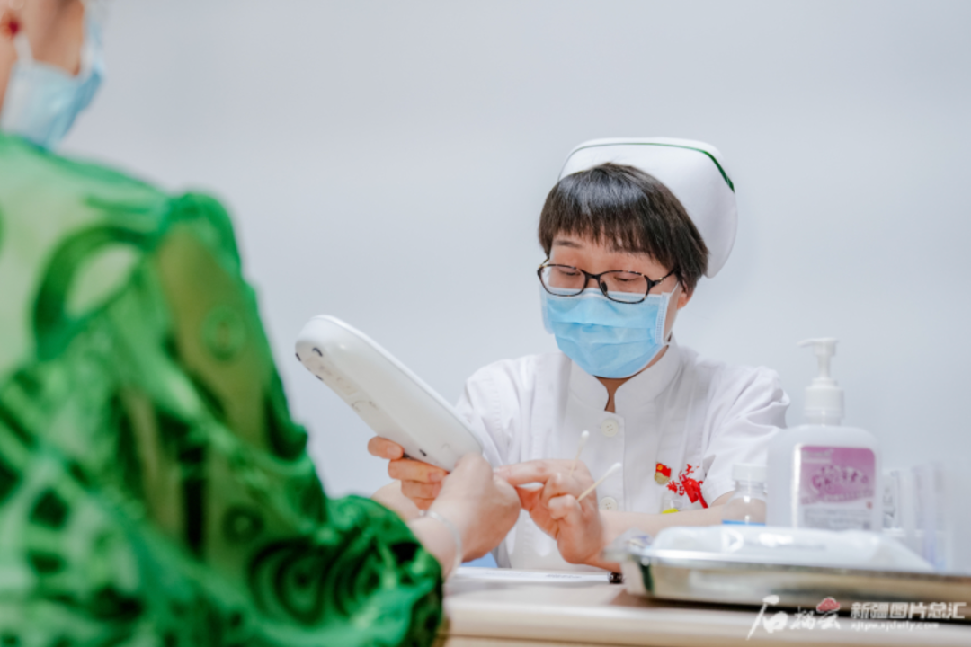 5月7日下午,beat365中文在线官网第一附属医院糖尿病护理门诊护士长徐静为患者测量血糖。石榴云/新疆日报记者 豆兴军摄