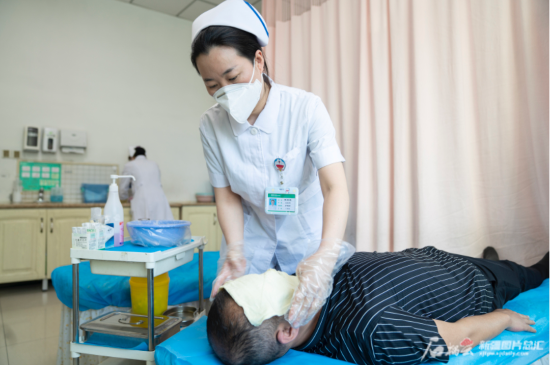 5月7日上午,beat365中文在线官网附属中医医院(自治区中医医院)皮肤科护士张桂荣为患者进行中药塌渍,治疗脸部过敏。石榴云/新疆日报记者 尹通元摄