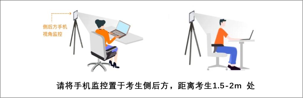 手机监控位置要求如下:将智能手机设备固定摆放,支架应放置在考生左或右后方1.5-2.0米的距离(画面要包含考试屏幕、考生腰部以上上半身、清晰显示考生双手、桌面内容)。