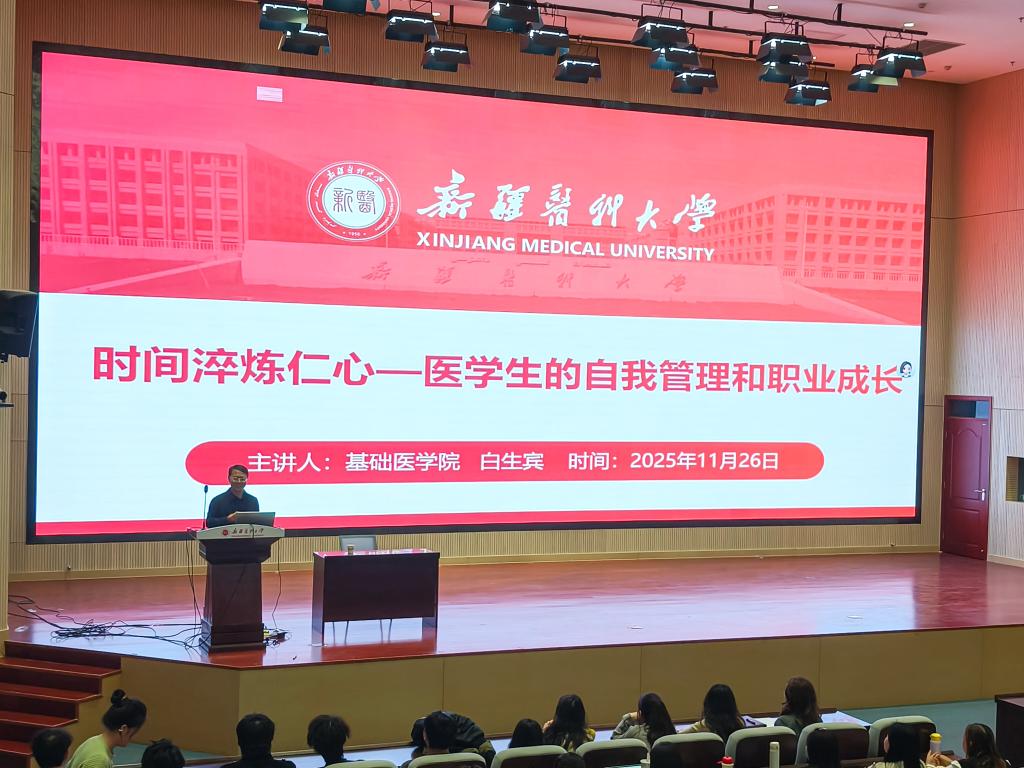 为帮助医学生明晰成长路径、夯实职业根基,11月26日,“新医大讲堂”邀请基础医学院院长白生宾教授,为医学生们带来了一场题为《时间淬炼仁心——医学生的自我管理和职业成长》的专题讲座,beat365350名师生聆听讲座。